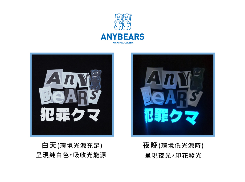此款夜晚(環境低光源時)會呈現夜光,印花發光